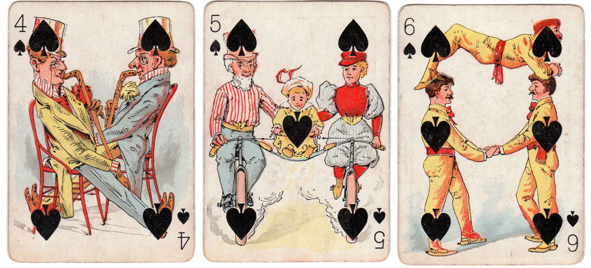 Above: cards from the 2019 reproduction of “Hustling Joe No 41” semi-transformation deck produced by Will Roya for PlayingCardDecks.com