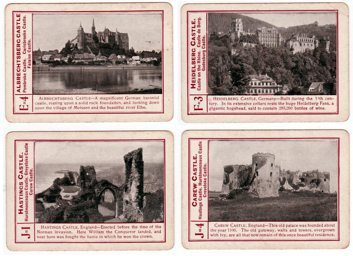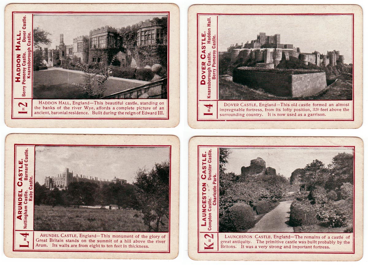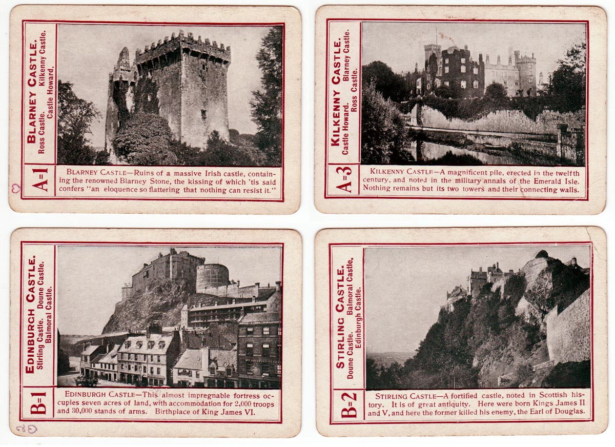 The Game of ‘In Castle Land’ (No.1113) published by The Fireside Game Co., Cincinnati, 1896 showing half-tone illustrations of famous castles, mainly from Europe. The Fireside Game Company was a sub-division of the United States Playing Card Company formed in 1896 to produce a series of educational card games.