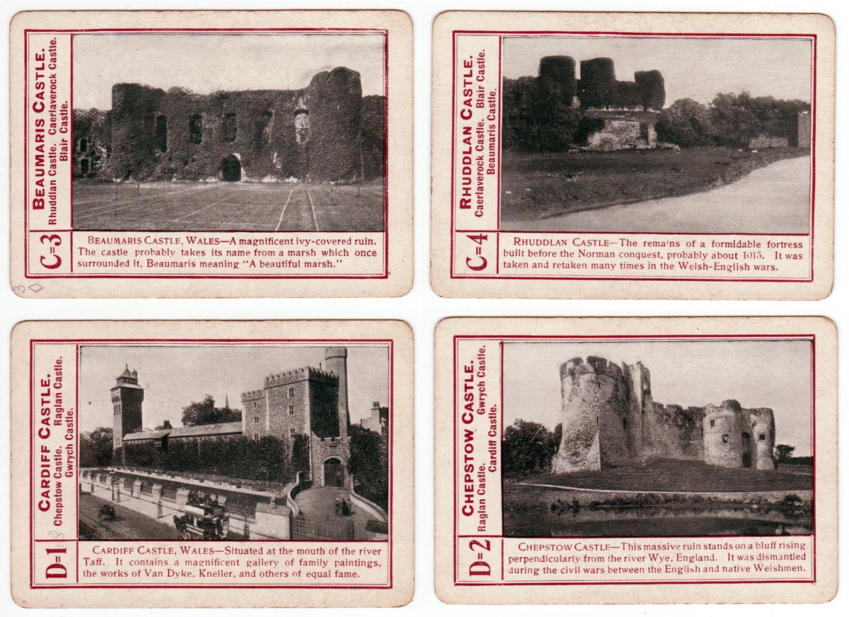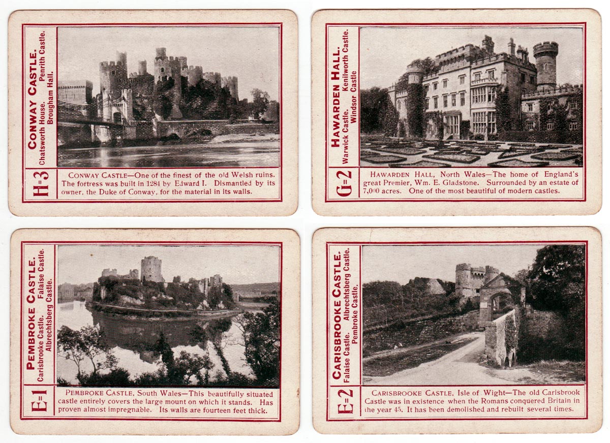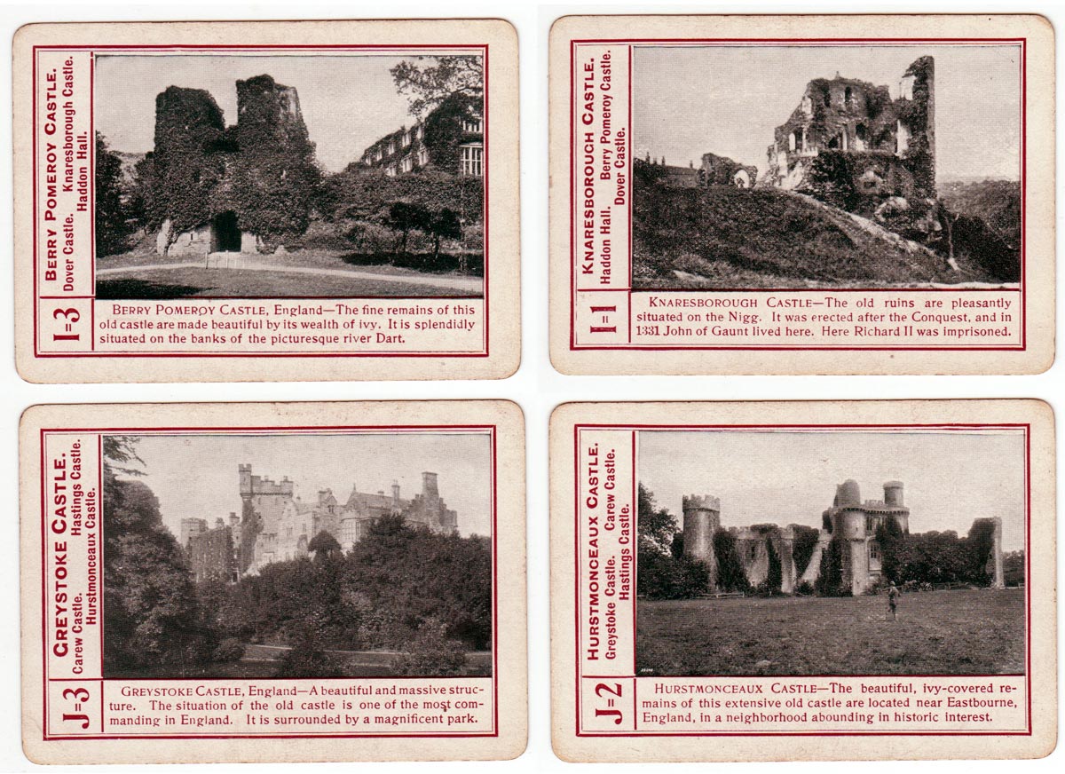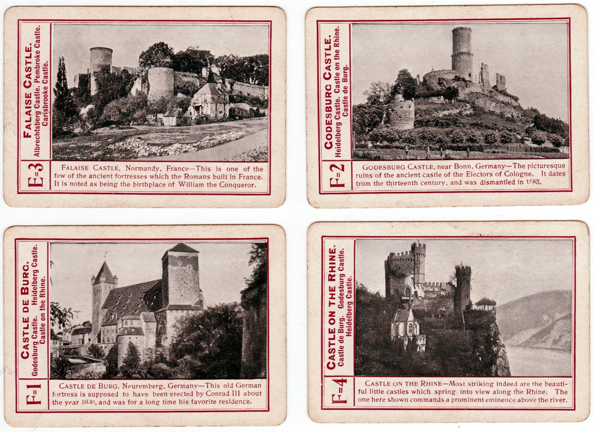 The Game of ‘In Castle Land’ (No.1113) published by The Fireside Game Co., Cincinnati, 1896 showing half-tone illustrations of famous castles, mainly from Europe. The Fireside Game Company was a sub-division of the United States Playing Card Company formed in 1896 to produce a series of educational card games.