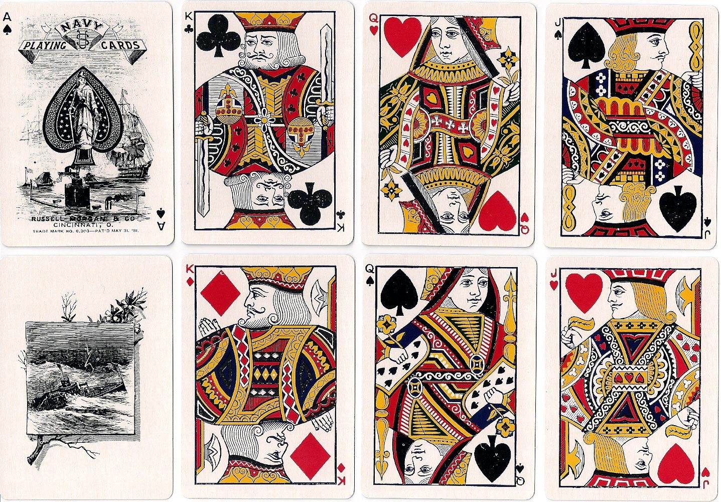 Armed Services playing cards were prominent in Russell, Morgan & Co's range of titles. “Navy No.303” is the companion to Army No.303 which was also first published in 1881 by Russell, Morgan & Co., Cincinnati. The picturesque Aces of Spades and Jokers were also embellished with battle scenes which tend to change over the years, and the Ace of Spades has the statue of Freedom in the centre.