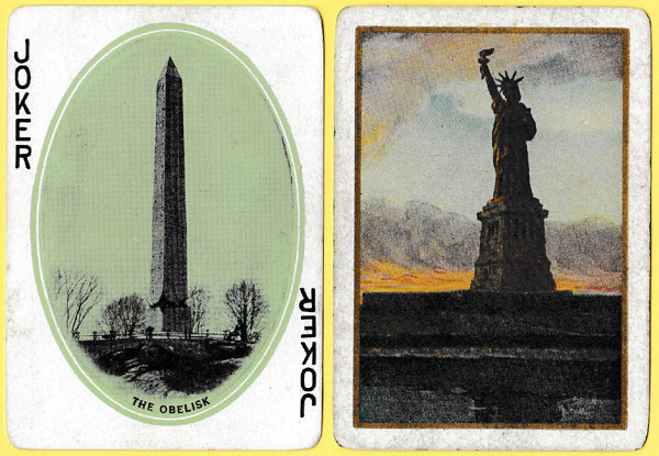 Published by the United States Playing Card Company in 1915, this souvenir pack shows oval photos of the 53 principal views of interest. The background colour varies according to suit: spades have a pink background; diamonds – a green background; hearts – a blue background; and clubs – an orange background. There is one joker, portraying the Obelisk, and the card reverse shows the Statue of Liberty, surrounded by a white border. See the box►