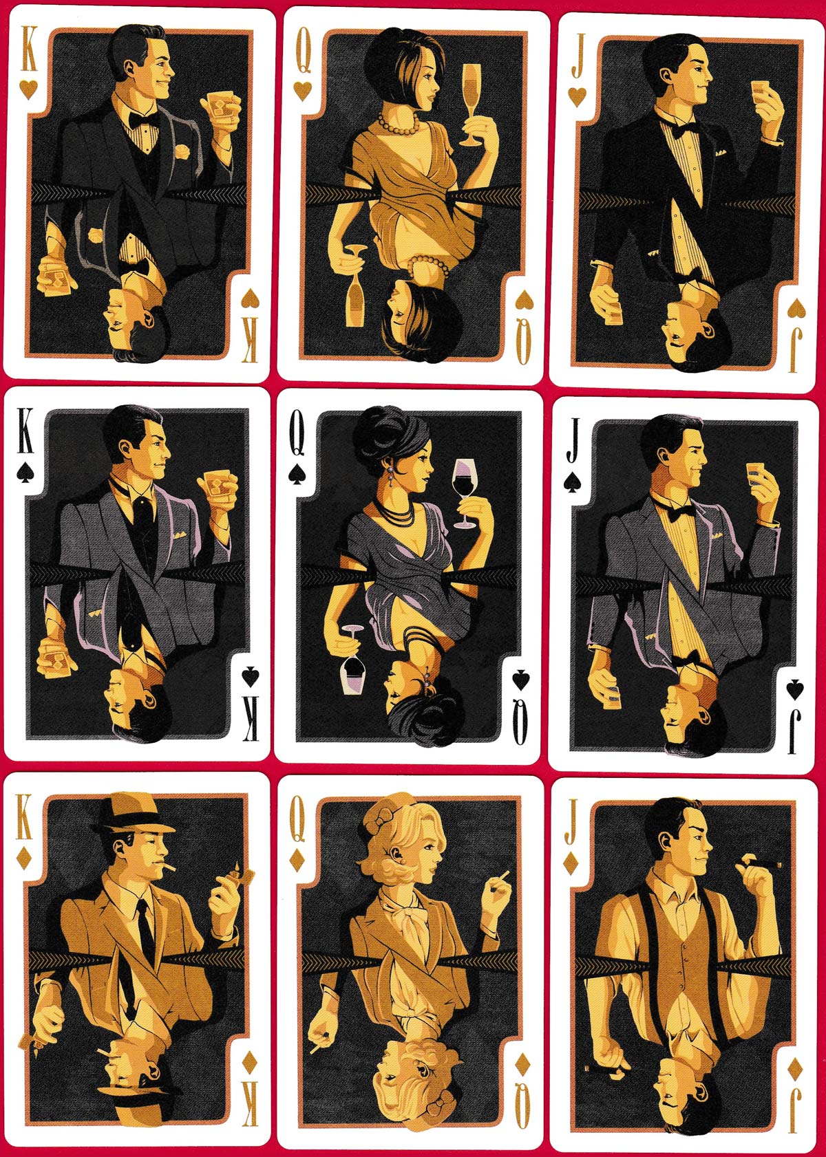 Inspired by the hit TV series Madmen, illustrator Aaron Johnson came up with this non-standard retro 60s vintage design pack. The back of the cards features a simple design filled with small, white dots against a teal green background. The court cards are fully customized, portraying women and men drinking and smoking, and all cards have a customised font. The hearts and diamond suits are in burnt orange rather than red. There are two additional advertising cards.