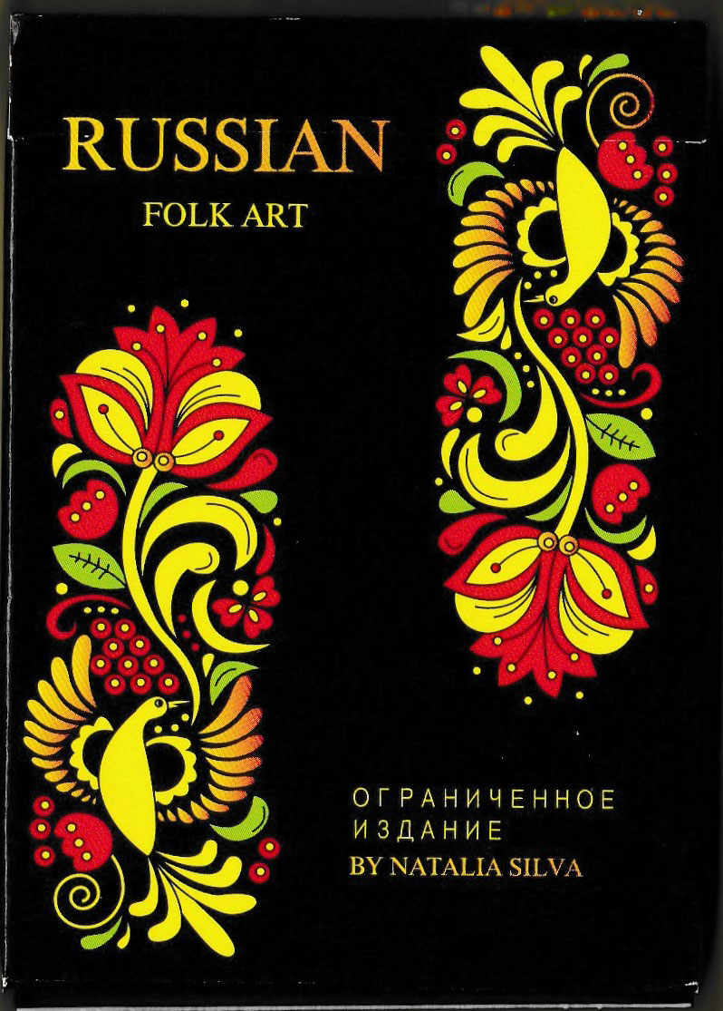 The 54 cards present folk instruments and dances, symbols and mythological characters, clothing accessories, flowers and the ubiquitous matryoshkas against a black background. with a traditional floral multi-coloured pattern on the reverse. The court cards have the Cyrillic abbreviations (T - Tuz, K - Karol’, D - Dama and B- Valet), and the suits are brightly coloured: spades and clubs – yellow; hearts and diamonds – red. The tuck box displays in Russian “Ogranichennoe izdanie” (limited edition).