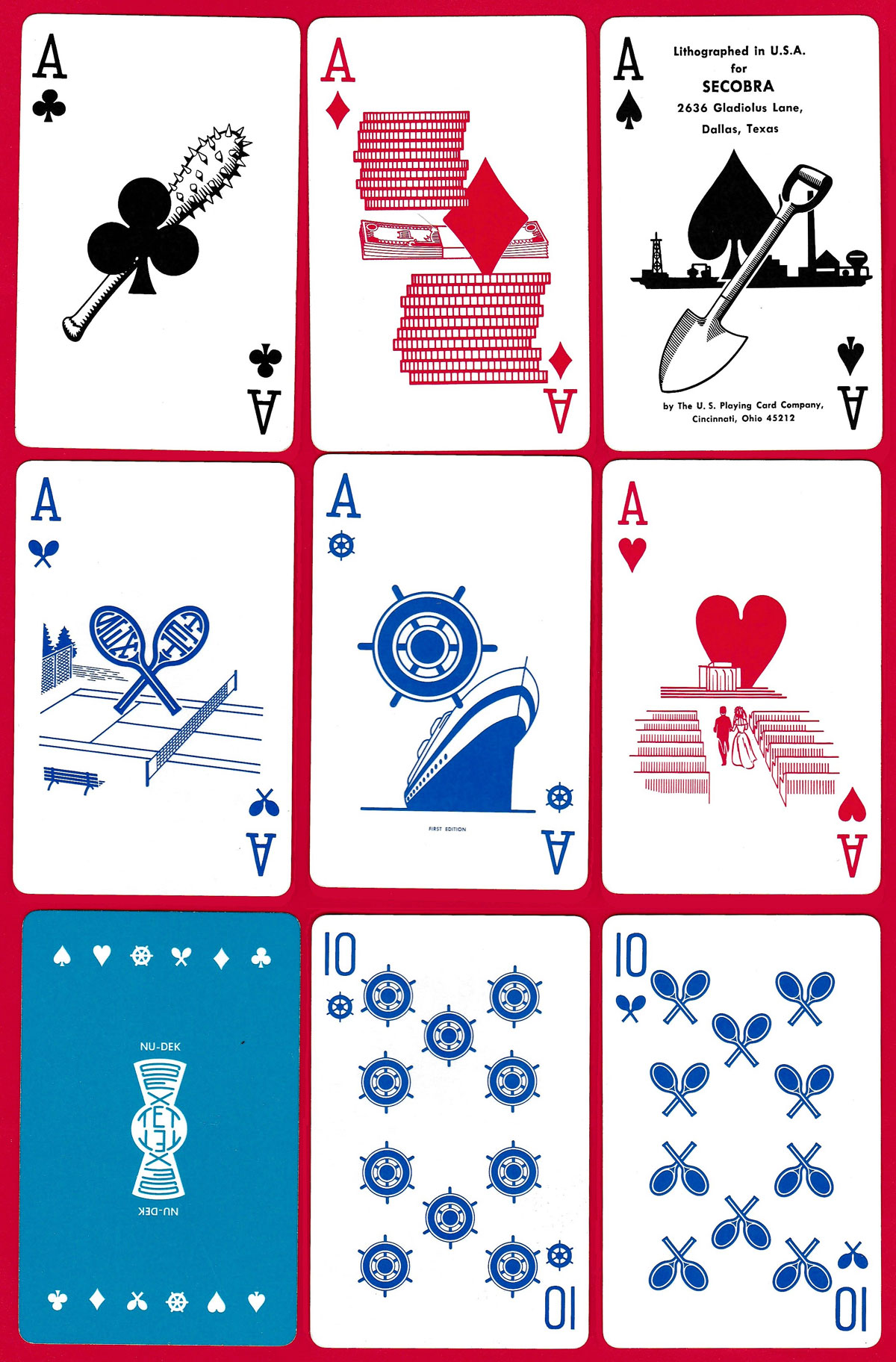 Published by Secobra of Dallas Texas, and printed by the USPCC in 1966, this pack was designed by Ralph E. Peterson. In addition to the four standard suits there are two new suits, both coloured blue: tennis racquets and a ship’s wheel or helm. All six aces are specially designed to provide a better representation of their suit. The cards were originally issued as a double set, with the rules for sextet contract bridge given on the inside of the box lid. My copy of this pack contains one joker.