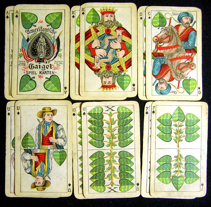 These decks were produced in various grades for the German immigrant population and feature the German eagle and the German and American flags intertwined. There were two versions: one with German faces and one with American faces.