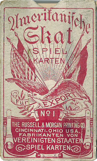 German-style American Skat playing cards were first manufactured by the Russell & Morgan Printing Co., Cincinnati, USA, in 1889. These decks were produced in two grades (unenamelled Skat #1 or double-enamelled Skat #2) for the German immigrant population. The designs feature the German eagle and the German and American flags intertwined on the box and reverse. There were two versions: one with German faces (after Wüst's designs) and one with American faces which contained 52 cards and a Joker (Skat #3 & #4). More or less identical Gaigel versions followed soon after.