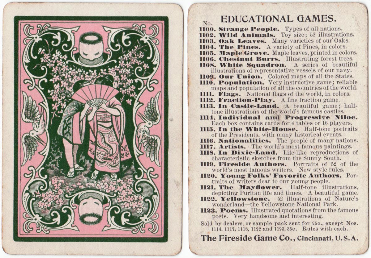 No. 1100 is the first game issued by The Fireside Game Company. Shortly after its founding, the company's name changed to The Cincinnati Game Company. Altogether approximately 40 educational decks were issued. A numbered series began with 1100 and ended with 1131, with no deck issued as 1107. There are nine, possibly ten, unnumbered decks. See also: Game of Fireside Authors►