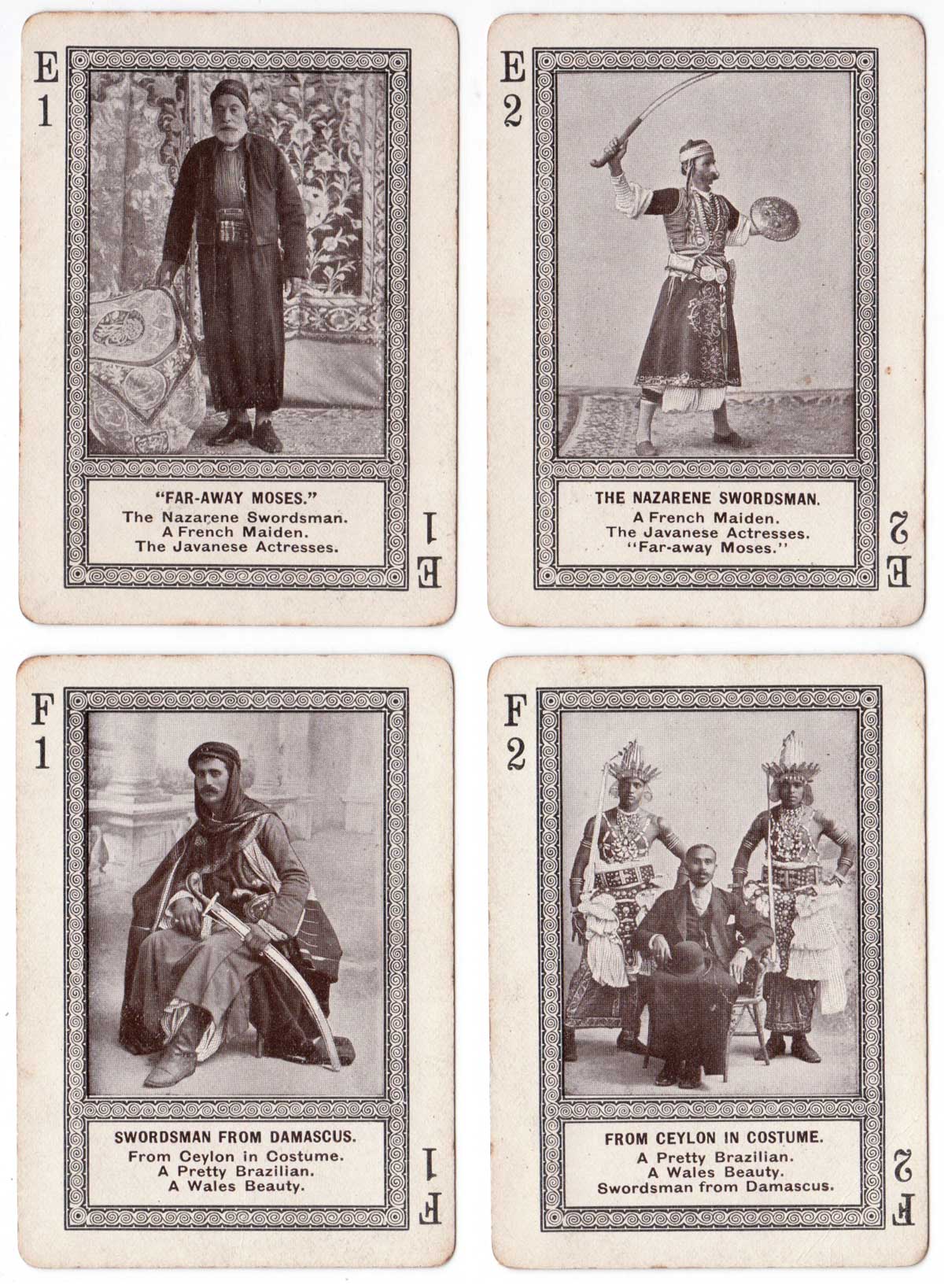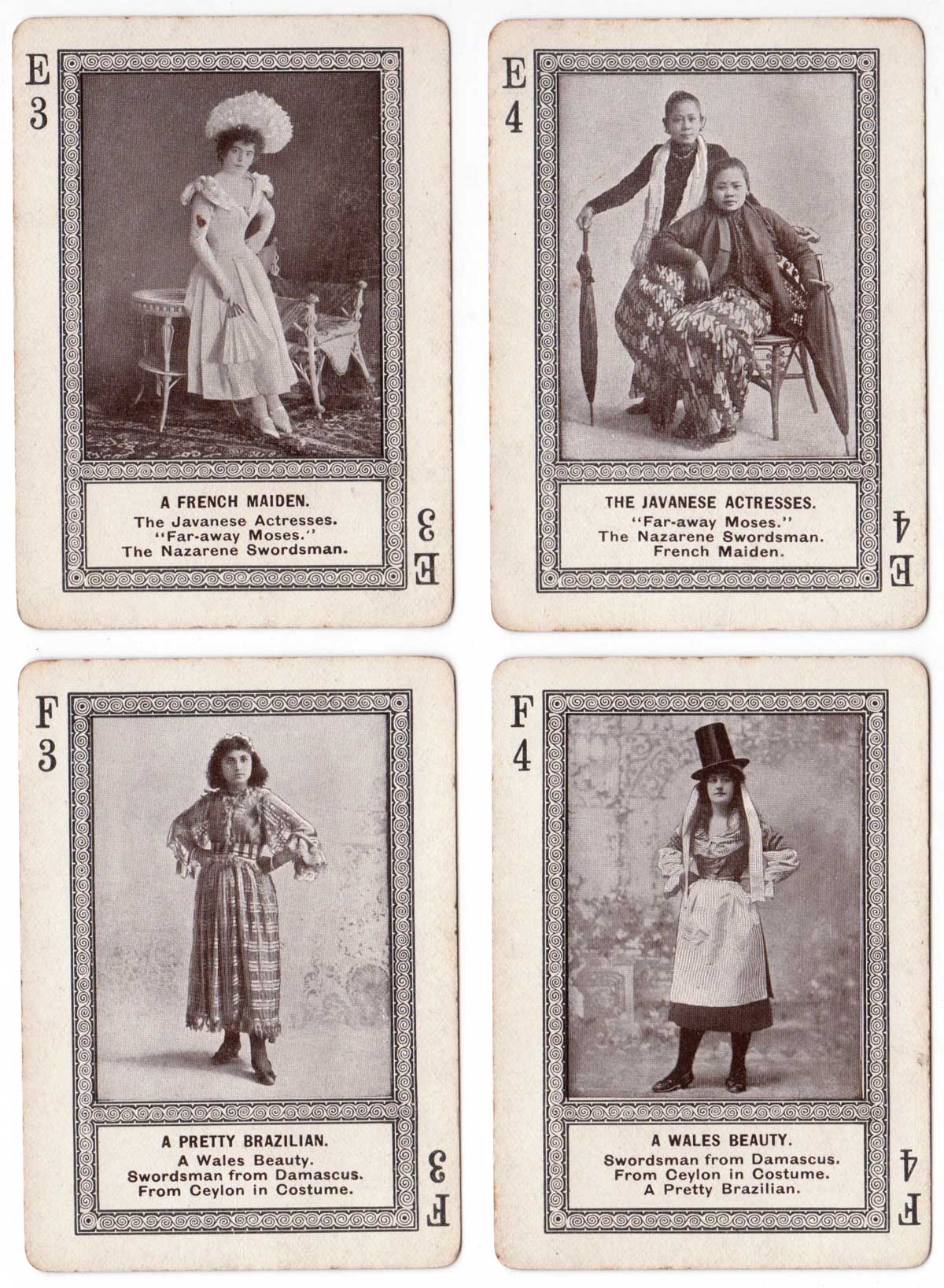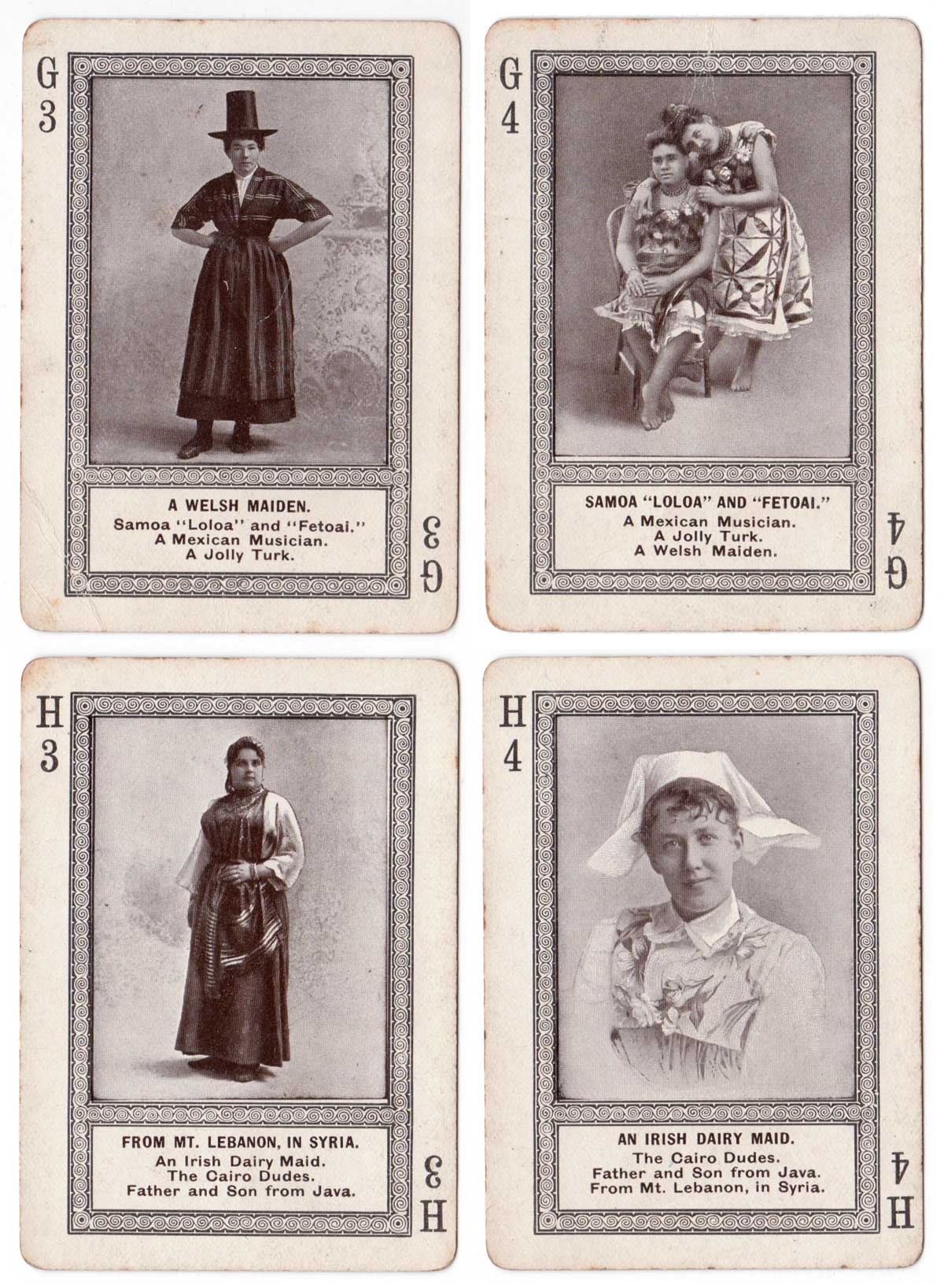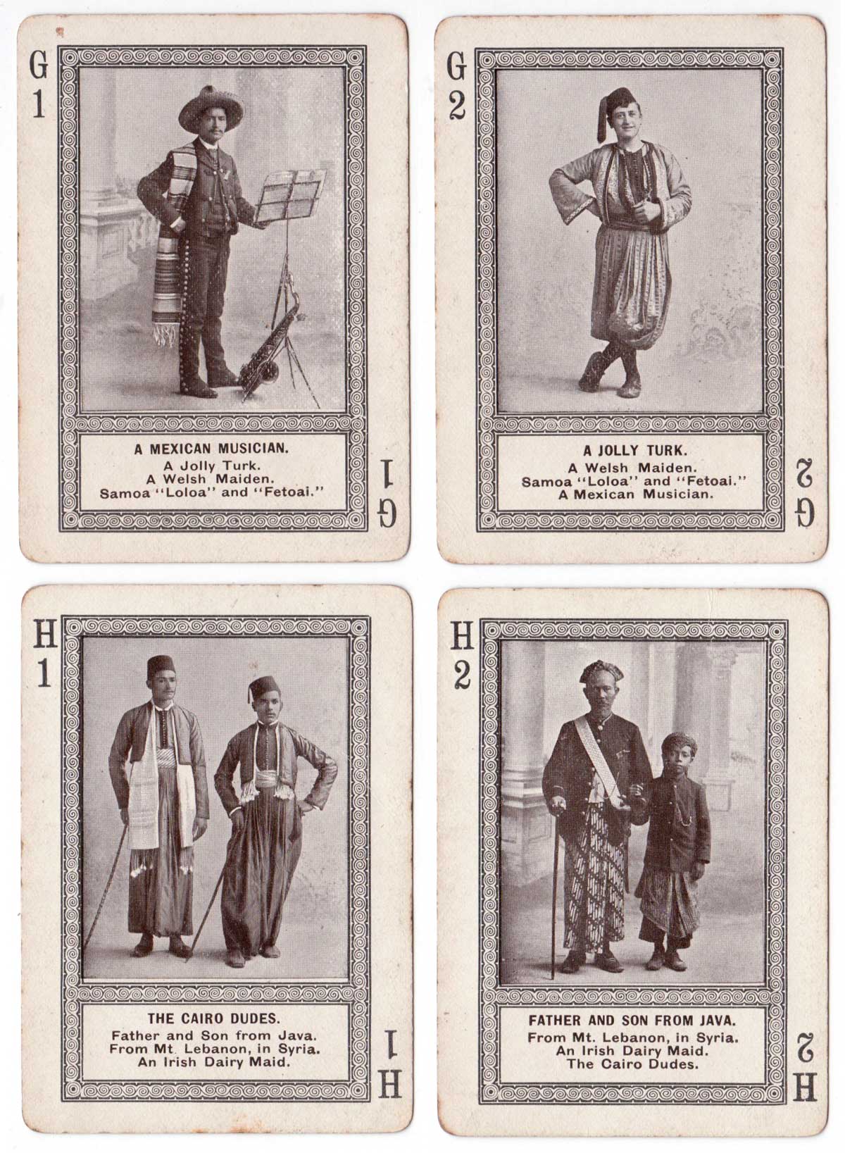 “Strange People” educational card game featuring half-tone photographs of people from different nations in their native dress styles from that era, produced by the Fireside Game Co. (a sub-division of USPCC), Cincinnati, 1895. See the back design►