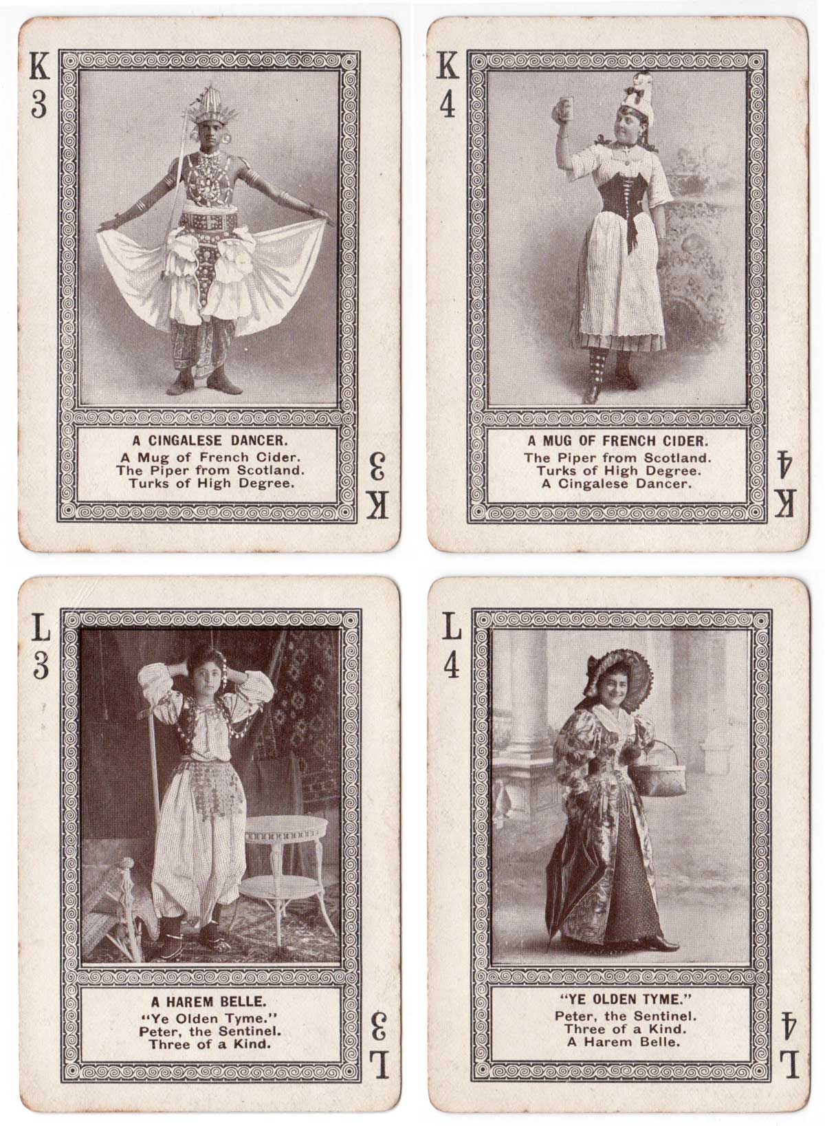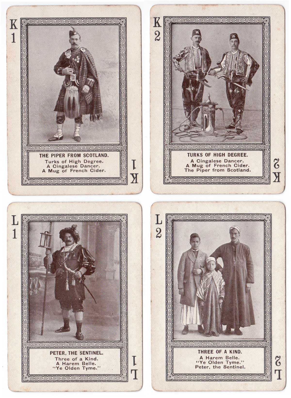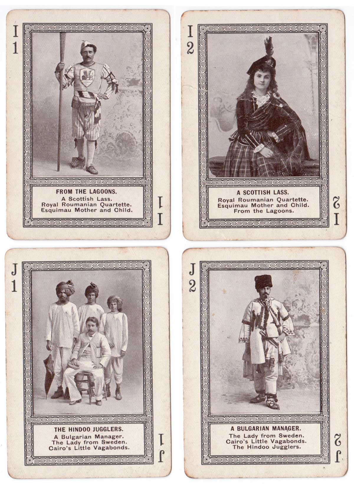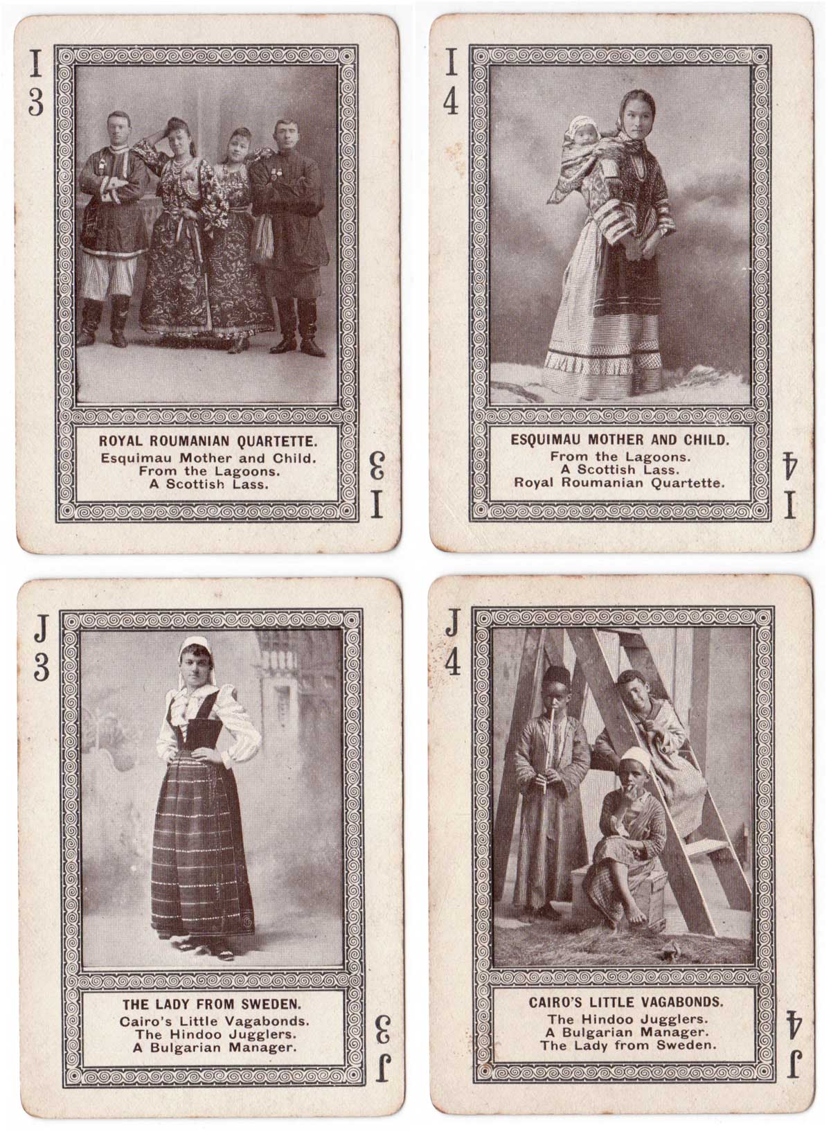 “Strange People” educational card game featuring half-tone photographs of people from different nations in their native dress styles from that era, produced by the Fireside Game Co. (a sub-division of USPCC), Cincinnati, 1895. See the back design►