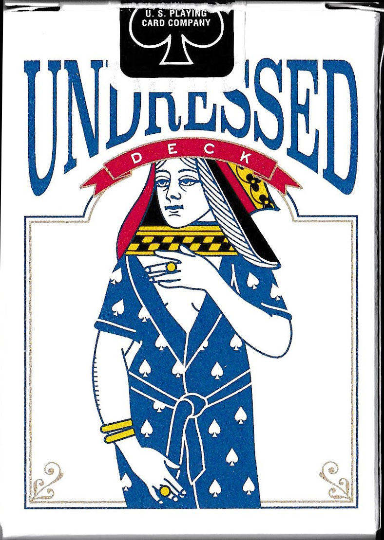 As explained by the accompanying card, this naughty though original pack was created by Edi Rudo and Néro Catineau while working on a magic act, and the graphic designer behind the cards was Julien Robic. While the aces and court cards are non-standard, the courts are shown in the nude (with the vital parts decorously hidden behind the respective suit symbol). The jokers show regal dress on a clothes hanger, and there is an extra double-sided card showing the king of spades and the queen of clubs dressed in bathrobes – presumably to effect the magic trick. The pack was printed by the USPCC in 2020. See the box►