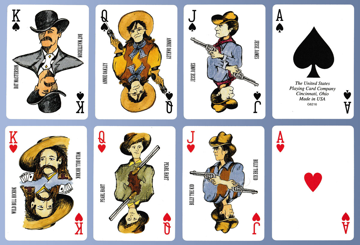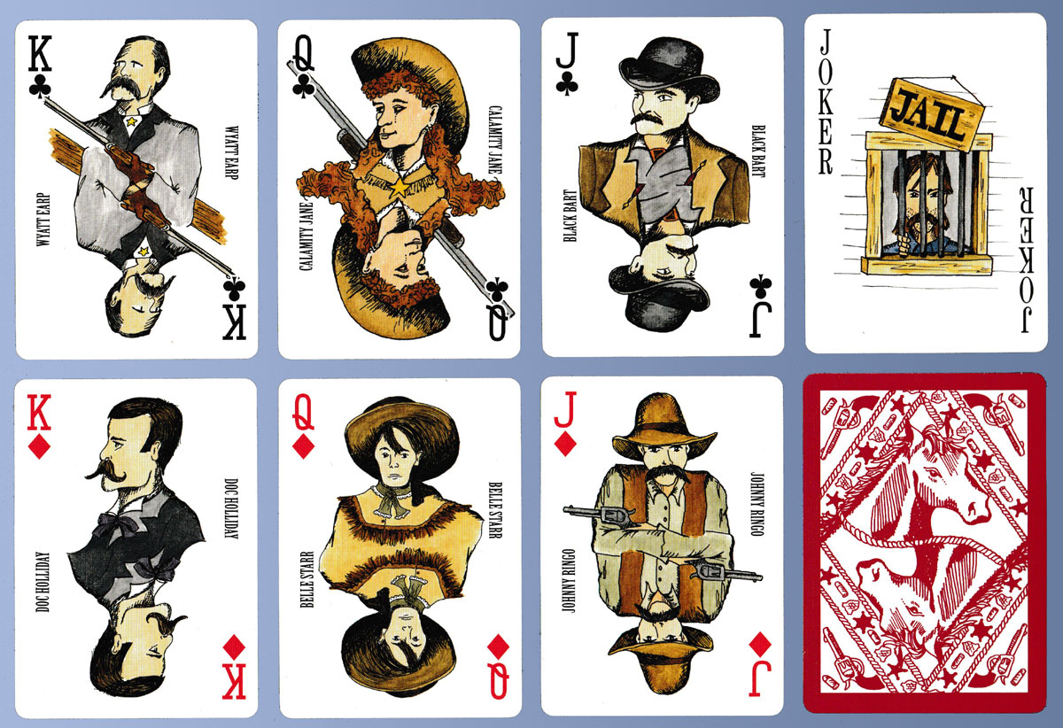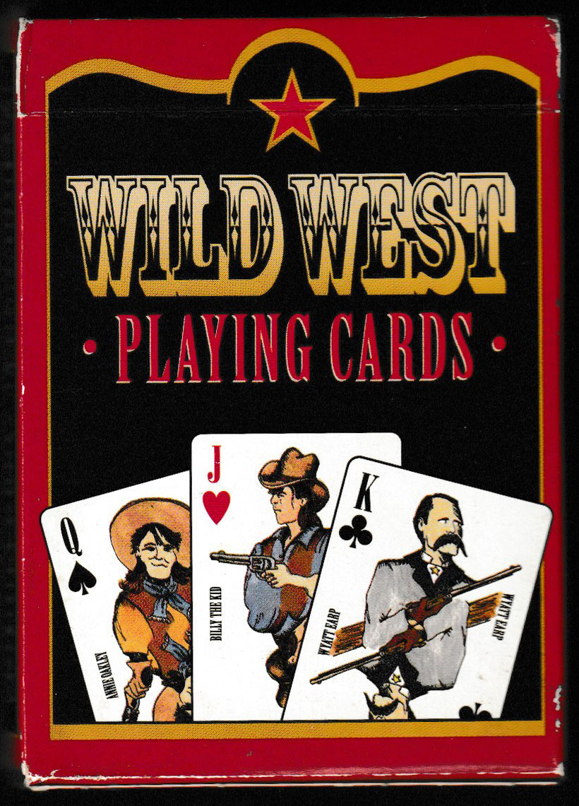 All the characters one would expect to find in a pack about the American Wild West are featured here – Jesse James, Annie Oakley, Doc Holliday, Wyatt Earp, Calamity Jane, Wild Bill Hickok, Billy the Kid, etc. The somewhat crude court card designs are double-ended. No artist’s name is given. Fashionwest Accessories seem to have specialised in the sale of items such as bolo ties, necklaces, earrings, etc. – in other words, essential wear for all good cowboys and cowgirls! See the box►