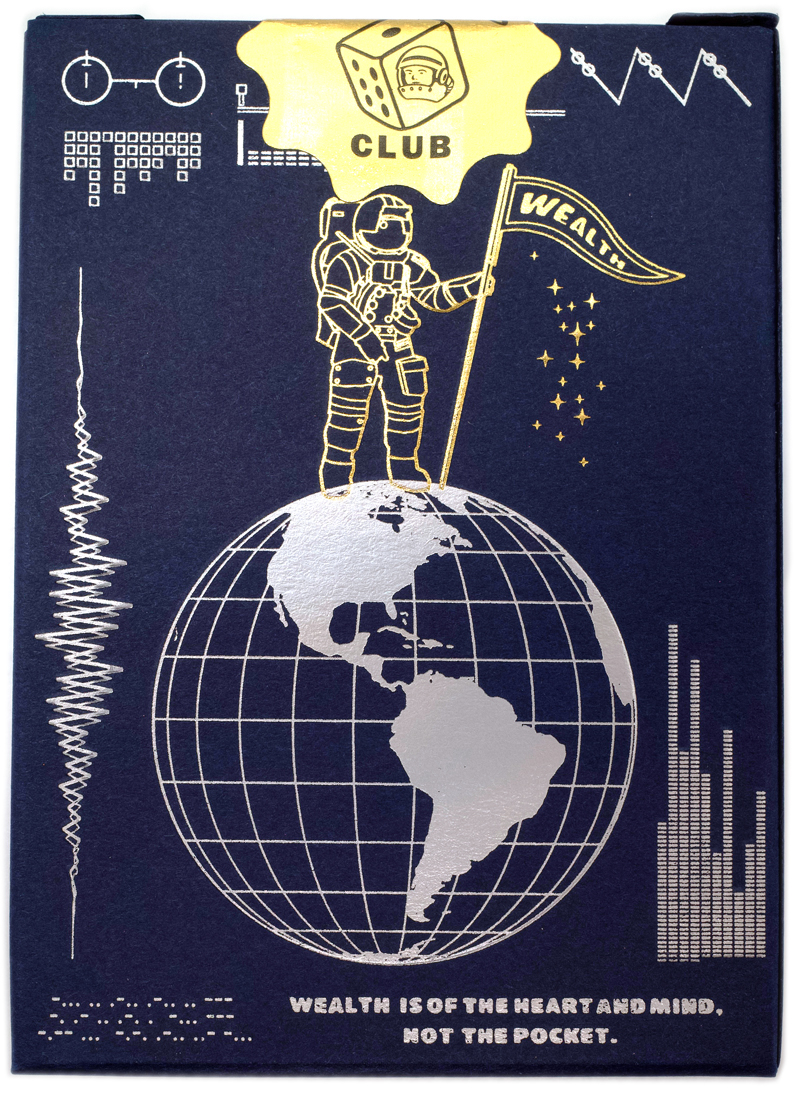 There are two themes in the design, 1) “a universe of infinite possibilities” with illustrations of astronauts and robots in space, and the courts re-imagined as “Cosmic Court Cards”; and 2) dollar signs and diamonds, shown on the back design, with the tagline “Wealth is of the heart and mind. Not the pocket.”