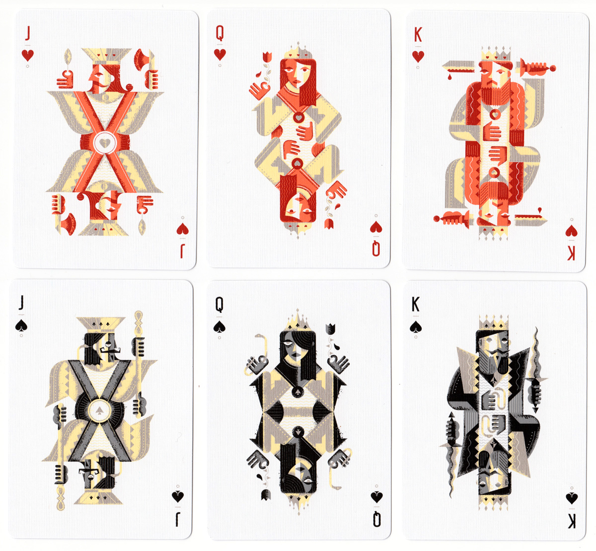 The courts and aces have fully custom designs, and the number cards also have flourishes. The deck has gold inks throughout the artwork, enhancing the retro style artwork.