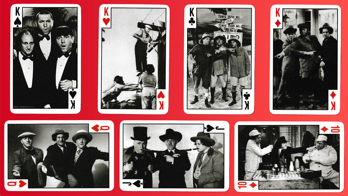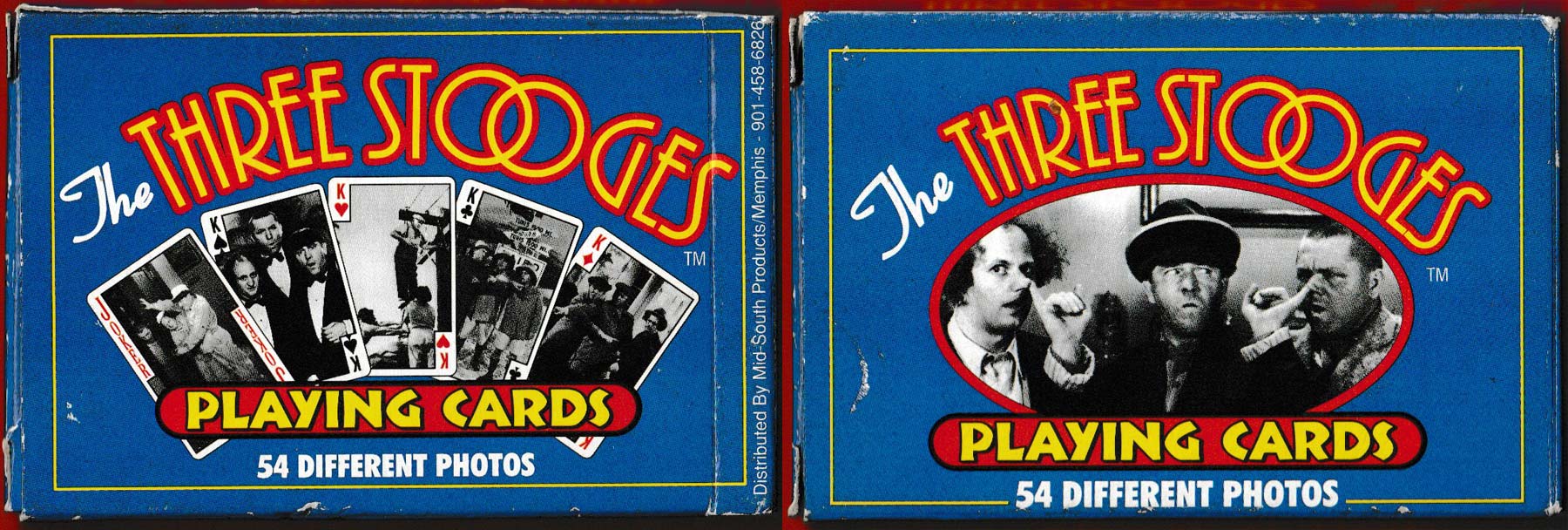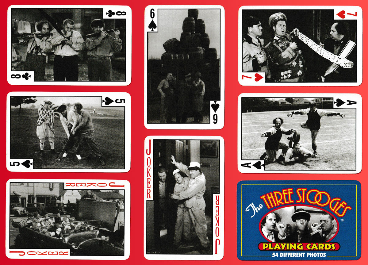 Above: The Three Stooges playing cards made in China for C3 Entertainment, 1999. 52 cards + 2 Jokers in tuck box. Size: 58 x 89 mm. ©1999 C3 Entertainment.
