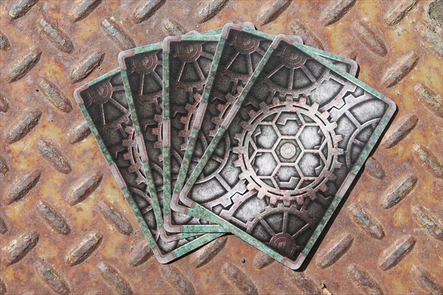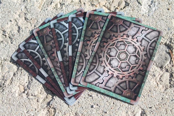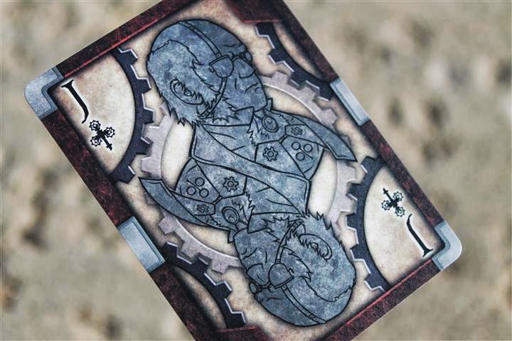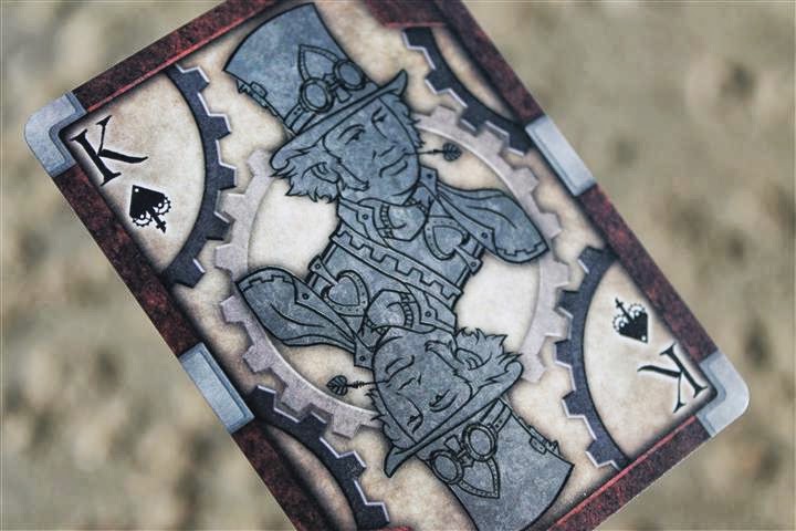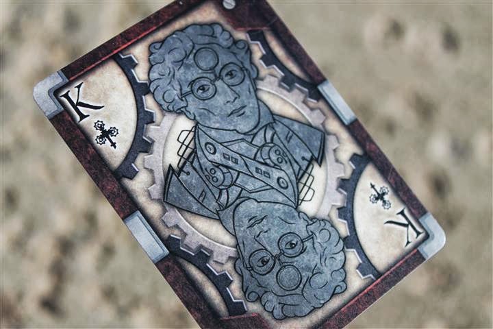 The cards are full-bleed, full color art, designed and polished from the ground up. The court/face cards are steampunk-flavored stylized portraits of important historical figures of the Industrial Revolution era, or those who have served as similar inspiration, like Rube Goldberg and Ada Lovelace.