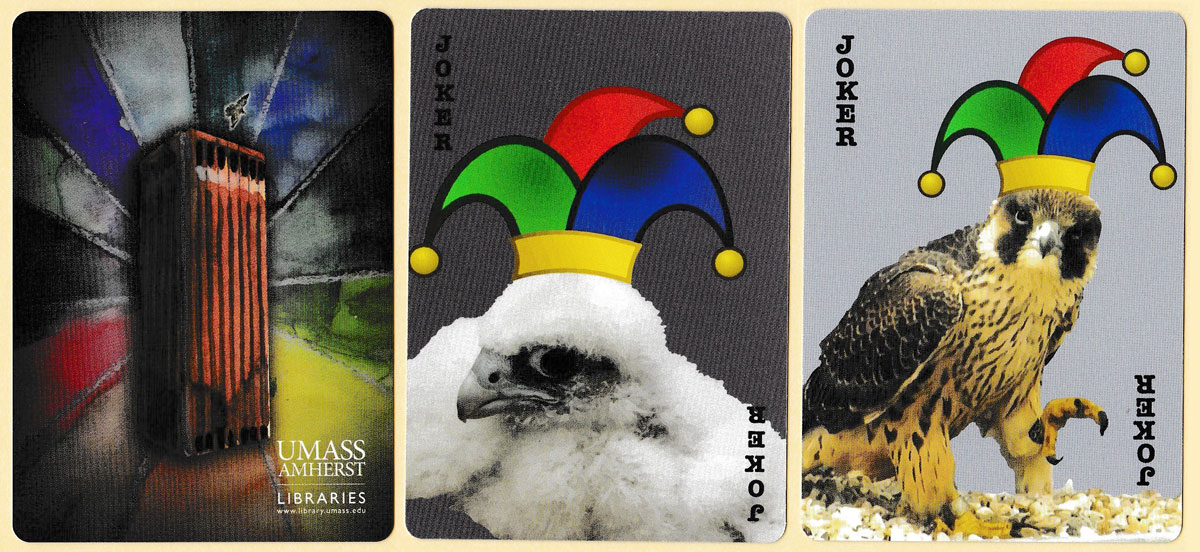 The main library is the W.E.B Du Bois library. This is a tall 28-storey building (see the card back), and on the roof is a falcons’ nest. For years, UMass Amherst has taken care of these falcons, and they have now become part of the community. This explains the fact that the two jokers are falcons wearing a jester’s cap.
