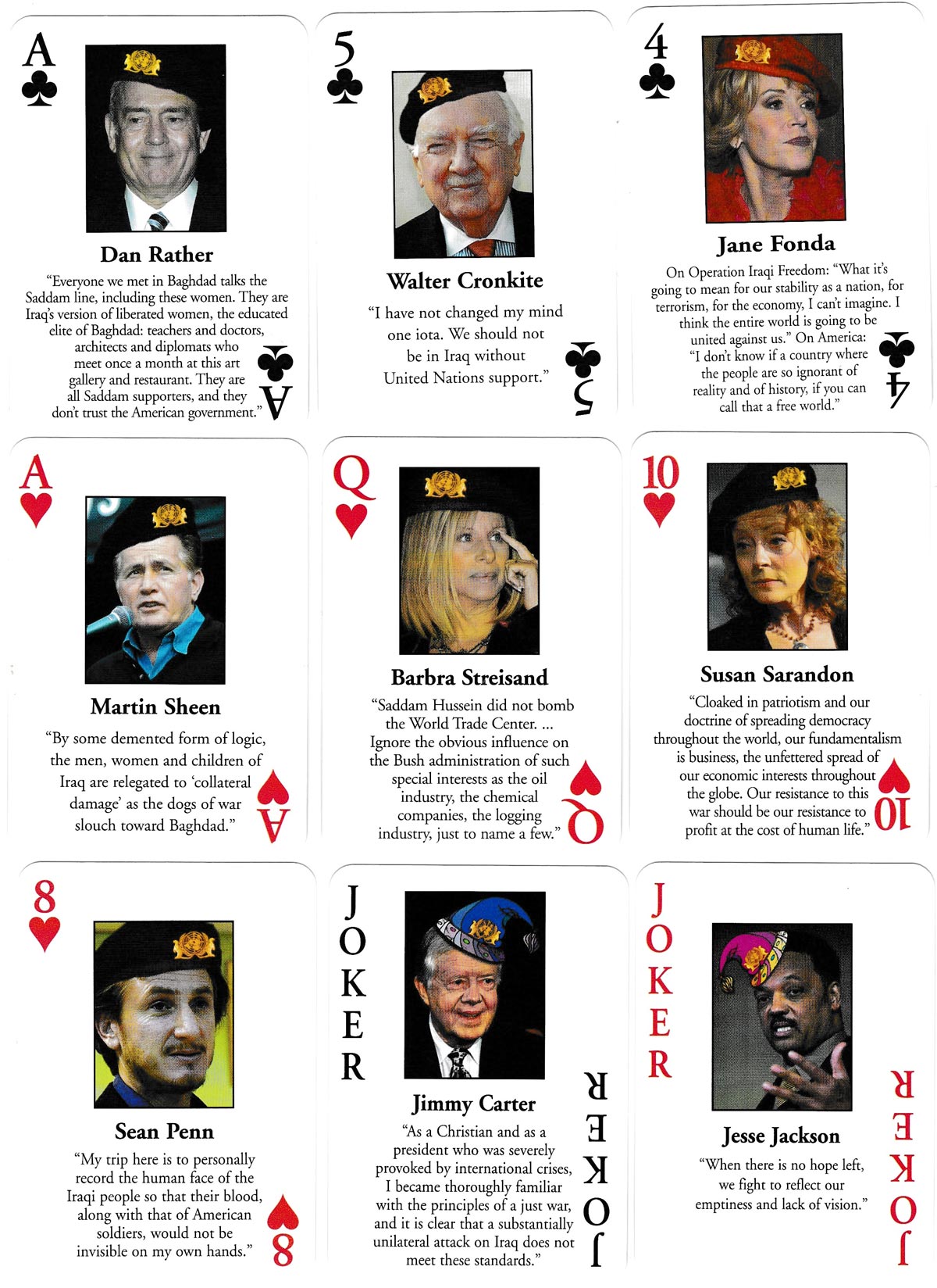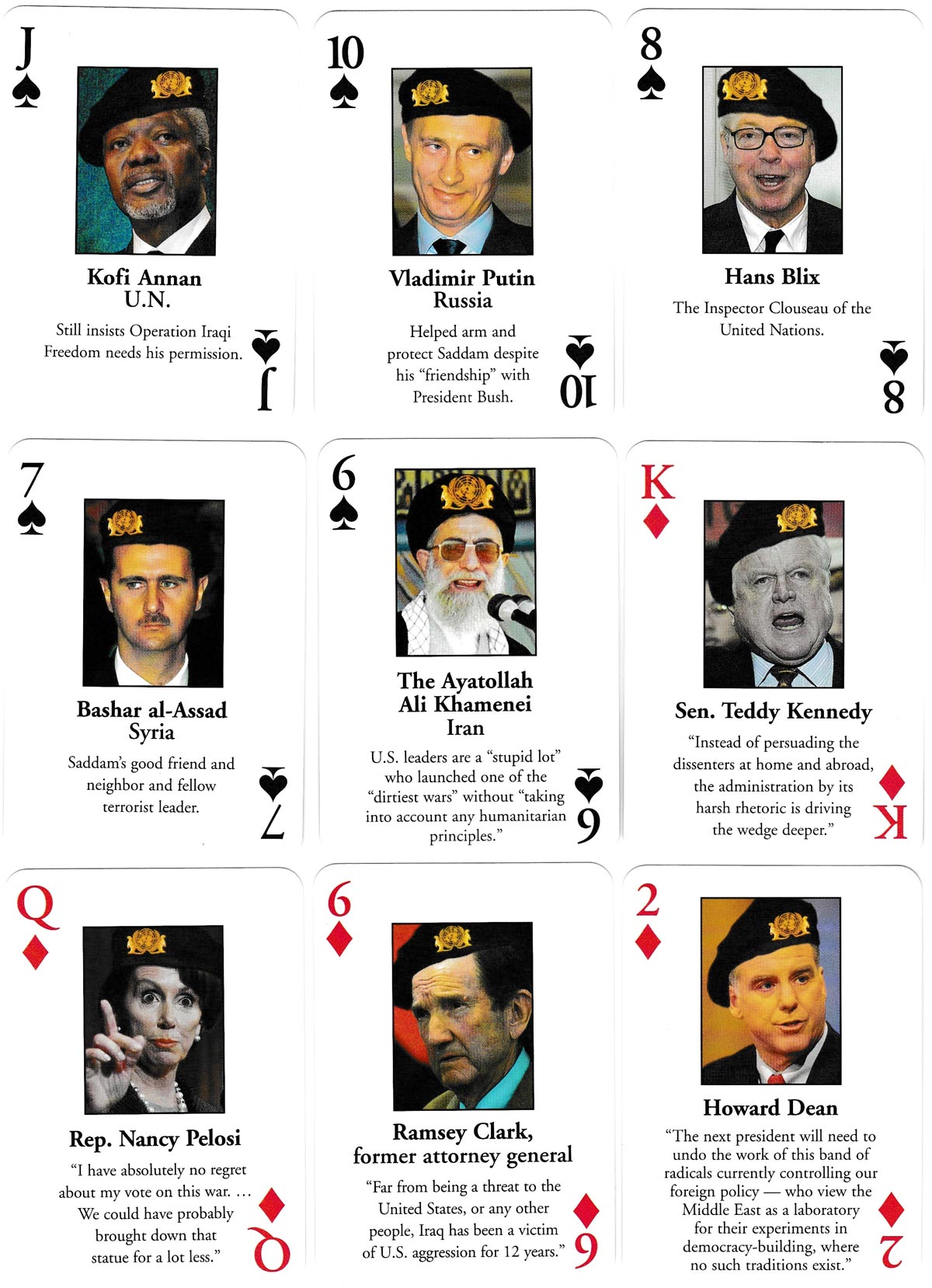 Published by NewsMax Media Inc. in 2003, this pack shows photographs of enemies of America and Iraq’s liberation, i.e. anti-war or war-critical public figures together with political leaders of “terrorist supporting countries”. The photos were doctored to add Republican Guard berets to the individuals portrayed. The jokers are Jimmy Carter and Jesse Jackson.