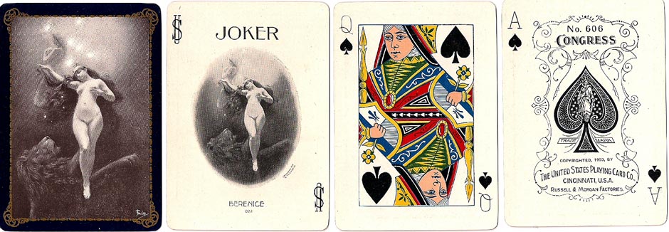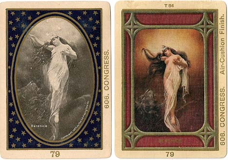 This particular deck, “Berenice” is taken from a work by the Spanish artist Luis Ricardo Falero (1851-1896) who specialized in female nudes and mythological and fantasy settings. Falero had a particular interest in astronomy and incorporated celestial constellations into many of his works. This particular design illustrates a legend about the hair of Berenice, which tells how the constellation Coma Berenices was formed. The card company did actually issue decks with variations of the picture, some sample cards are shown (left) which might have been less risqué by veiling the full nudity. Images courtesy Rod Starling.