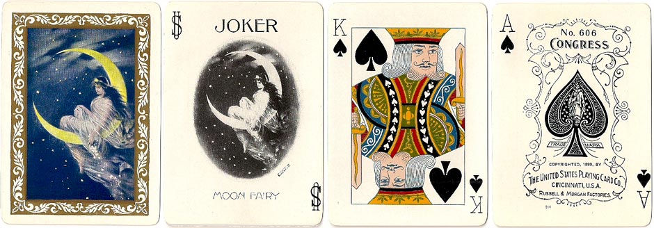 Above: Congress No.606 deck titled “Moon Fairy” by U.S.P.C.C, 1899. This fine Ace of Spades was used on higher quality, gold edged editions which are relatively rarer to find. There were other versions of this back issued around the same time with a different border or a black background. Images courtesy Rod Starling.