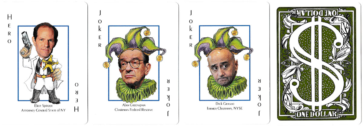 While the individuals lampooned on the cards and the wry comments beneath may have resonated at the time, the majority of names have long faded from public memory. The "hero" card depicts Eliot Spitzer, the "Sheriff of Wall Street".