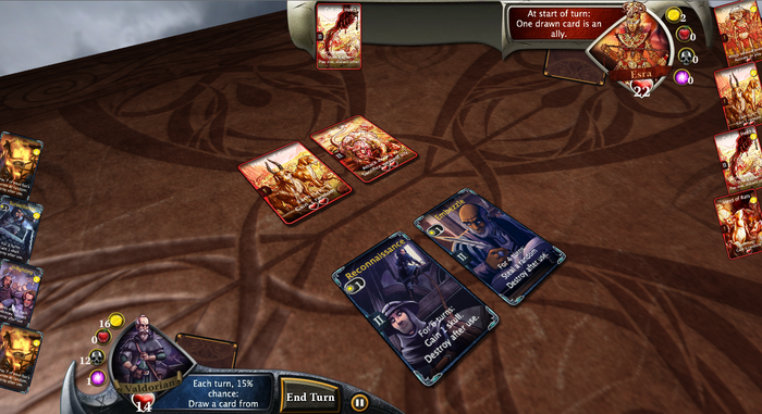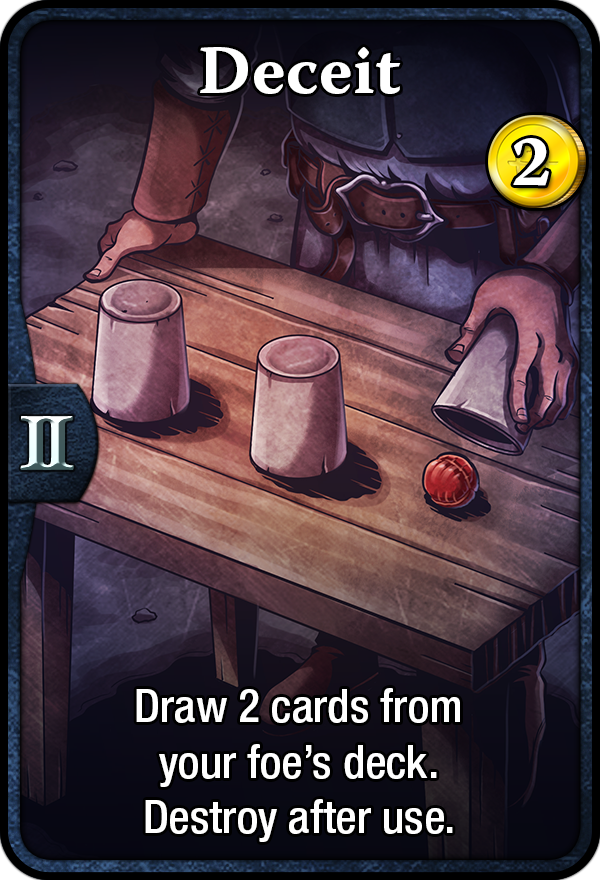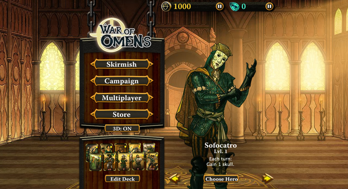 War of Omens is a strategic card game set in a dark fantasy world, depicting the evolving political and military struggle between three distinct, warring factions. Players will take on the role of a hero representing one of these three factions, with the player's deck representing spells, tricks, techniques, and troops, and take their deck into battle against other players or a computer opponent.