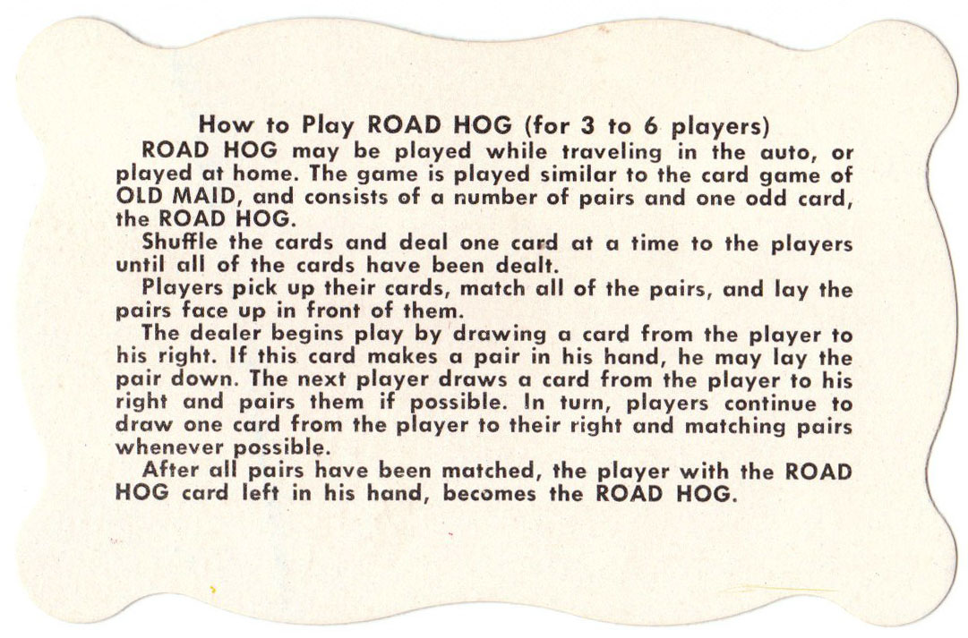 Highway Travel card game no.446 by Warren Paper Products, in the Built-Rite series, with cards shaped to fit the hands, making them easier to hold. The game play simulates riding along the highway in an auto locating objects along the roadside that match the cards, and includes instructions on how to play an alternative game called Road Hog►
