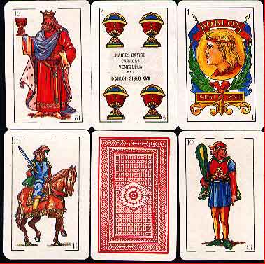 During the 18th, 19th and early 20th century cards were exported to Venezuela from Spain, notably Málaga and Cádiz. Venezuela levied a stamp tax on imported cards in 1985. This tax amounted to 100% unless the cards were made in Spain, in which case it was 20% of the value Packs published in Venezuela in recent years have been of the Catalan type, based on designs from Barcelona. A high proportion of them have square corners, 40 cards and no jokers. As bullfighting is practised in Venezuela, many Venezuelan packs have brand names alluding to bullfighting, typically “El Torero” like the one shown here. However, no bullfighting packs as such are known outside Spain and Mexico. Known Venezuelan manufacturers include Naipes Dural, Naipes Fortuna S.R.L., B.G., Naipes Catire and Productos Nacaral.