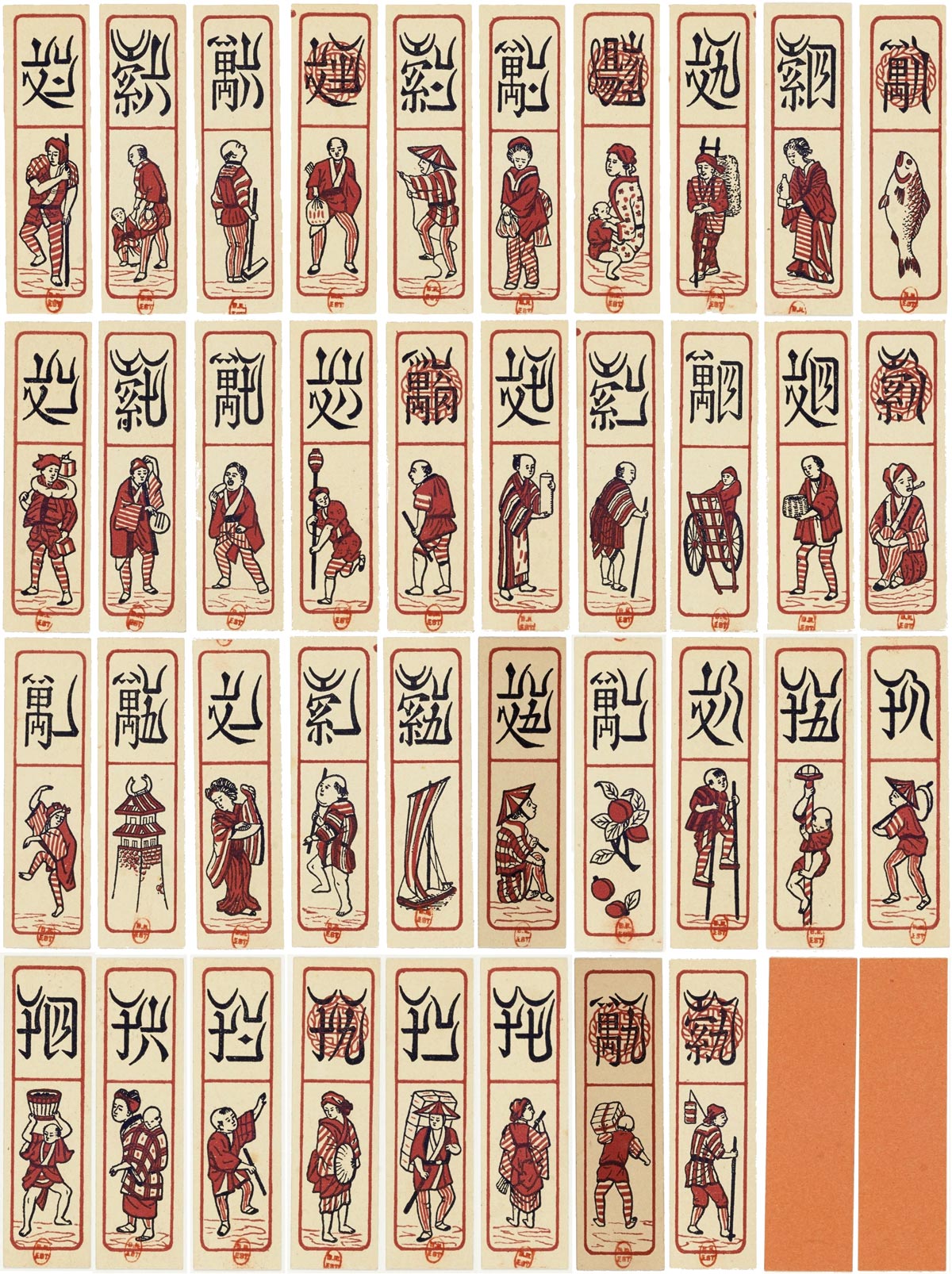 Above: Chinese card game used at Haï-Phong, manufactured by Camoin (Marseille) c.1870. Woodcut in red and black; 8.3 x 2.3 cm; orange backs. Source gallica.bnf.fr / Bibliothèque nationale de France • Jeu de cartes chinois employé à Haï-Phong►