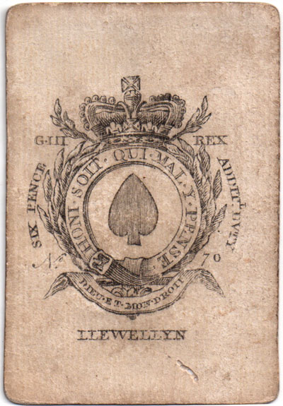 ohn Llewellyn was a playing card manufacturer active between the years 1778-1785. During this period he traded at No. 25 Piccadilly, London. The image above shows an unopened pack of Great Mogul playing cards, in it's original wrapper, still bound with the string and showing the embossed tax stamps. 'Her majesty' would have been Queen Charlotte, wife of George III. It is not known whether John Llewellyn was a Welshman, or a descendant of a Welsh family who had moved away, but it seems likely. His name is not in the list of liverymen of The Worshipful Company of Makers of Playing Cards nor does it appear in British Library records. Little is known about him.