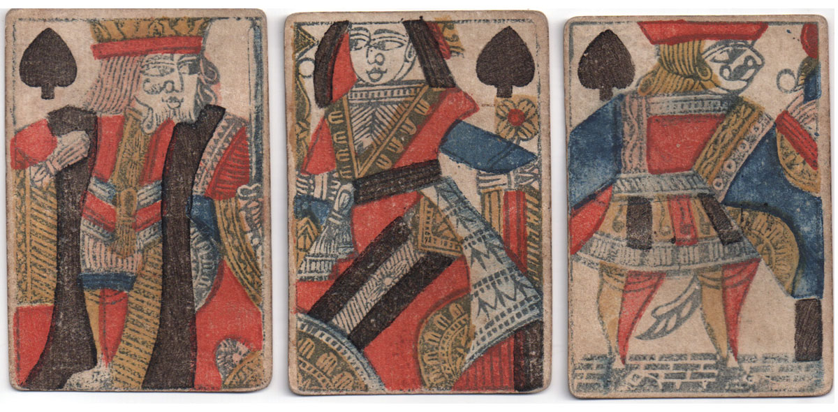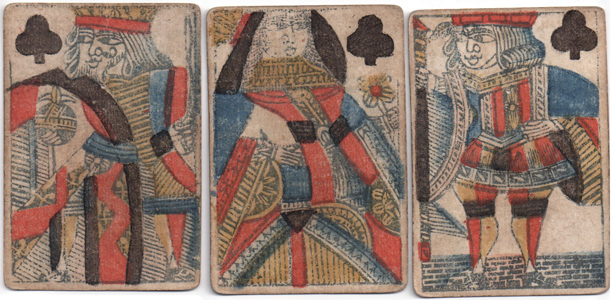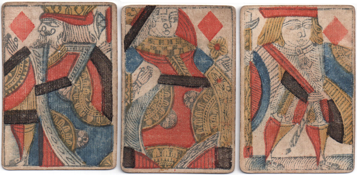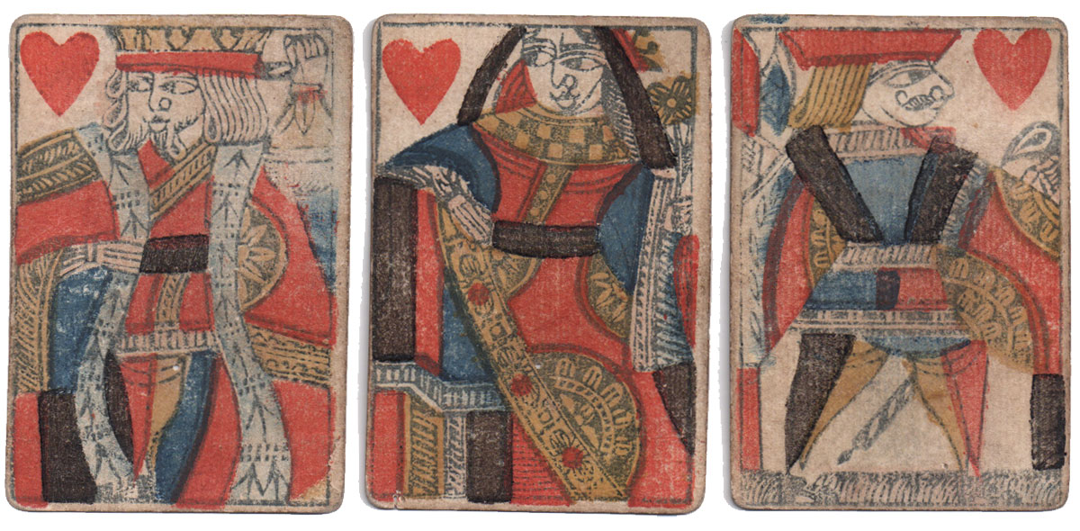 The cards were printed from copper plates, with the red suit symbols being applied later by stencil....