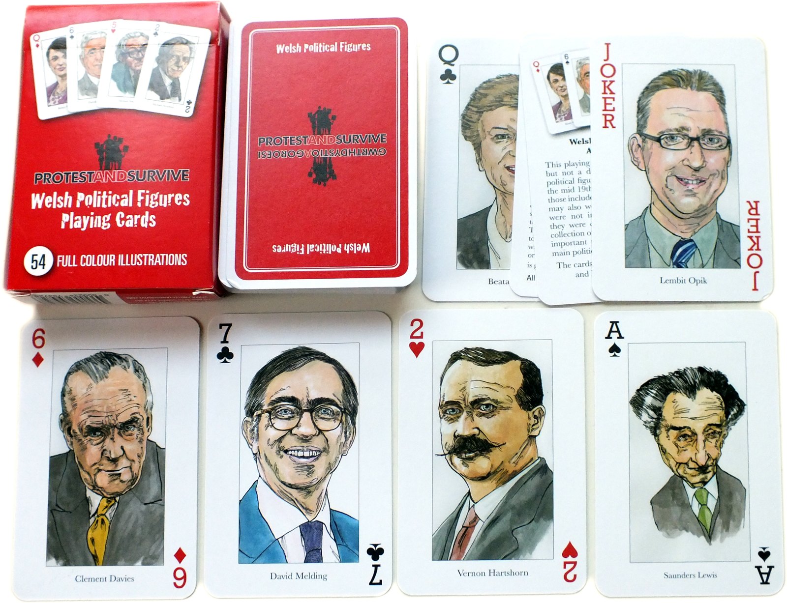 Above: cards from 'Welsh Political Figures' playing cards published by Protest and Survive Ltd, Cardiff. The cards are the combined work of the artist Dan Peterson and political historian Professor Russell Deacon. The first edition is of 1,000 packs only.